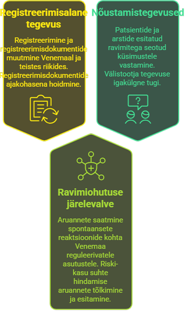 Lisaks turustamisele osutab meie ettevõte ravimiohutuse järelevalve ja regulatiivsete nõuetega seotud tuge nii Euroopa Liidus kui ka Euraasia Majandusliidus.